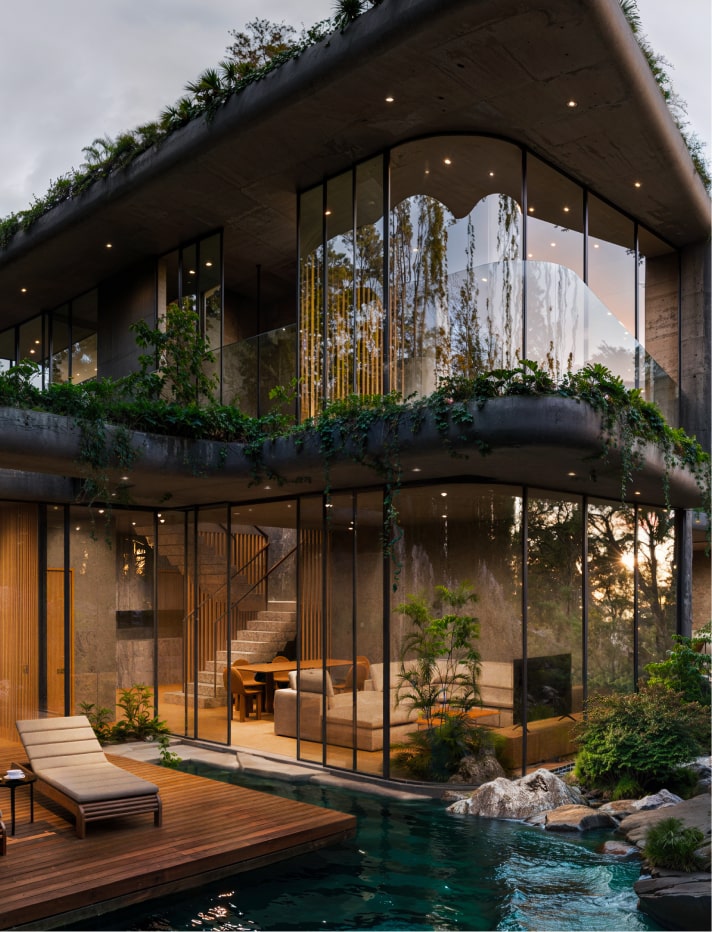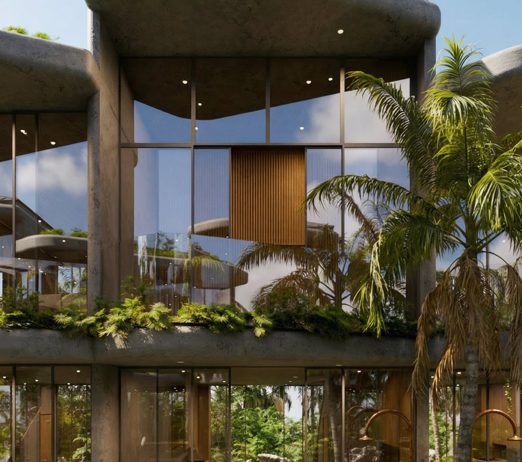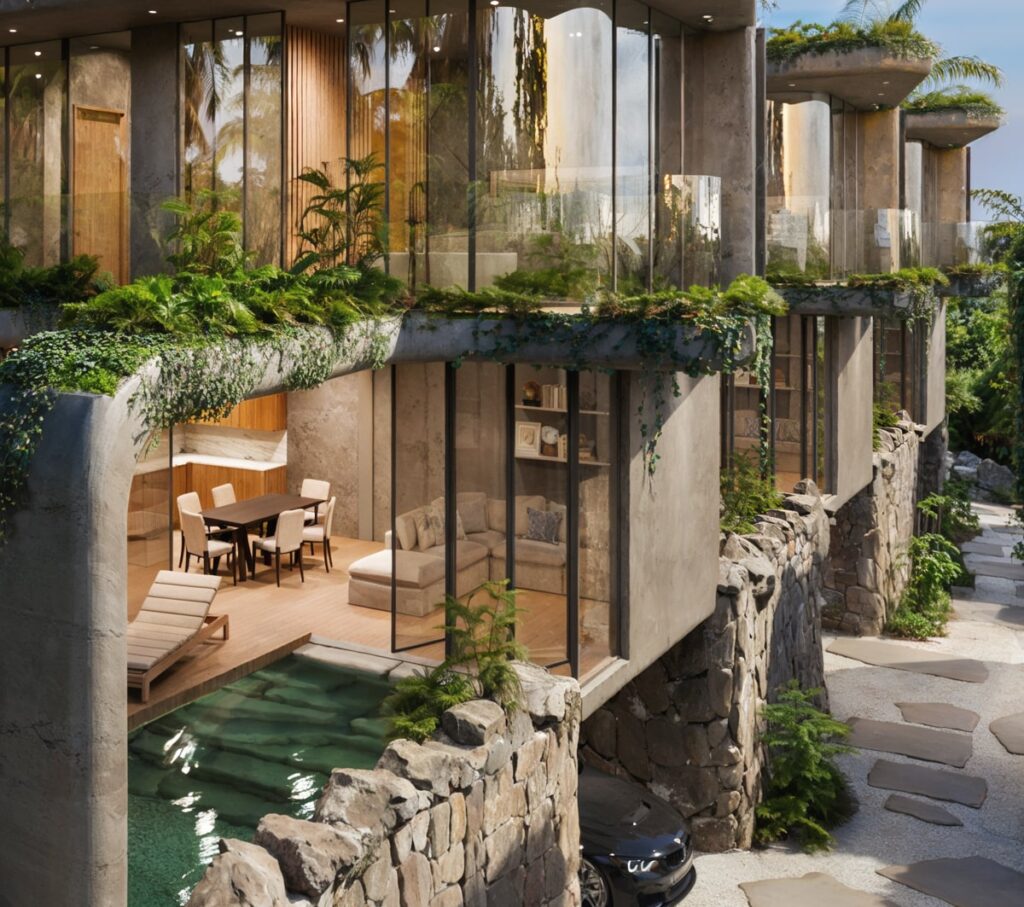 Front row 3 bedroom villas facing the valley and the ocean, with gorgeous 30 sq. m private pools, large balconies, terraces and greenery both on the lot and in front of the windows. At a total surface of 111 sq. m and space for a car or an additional terrace, floor-to-ceiling glass facades these villas are breathing lightly and at the same time provide you with scenic privacy.