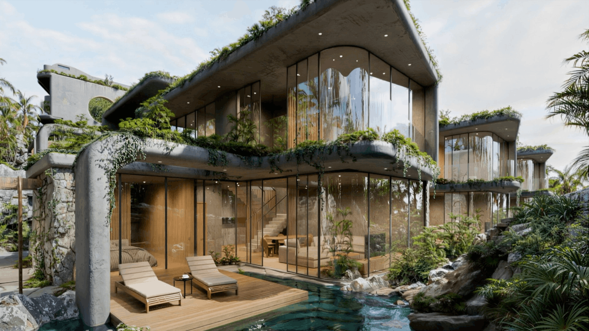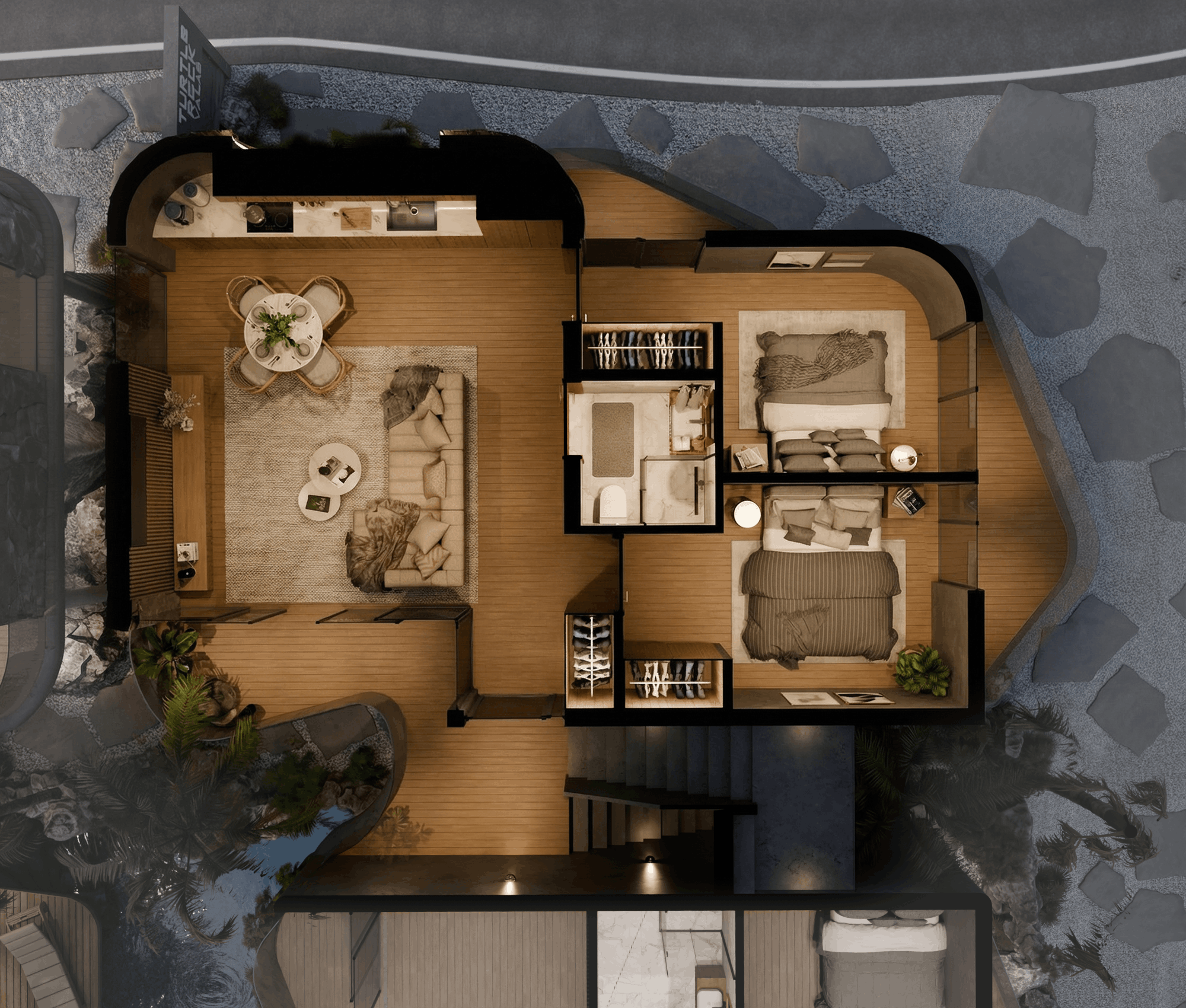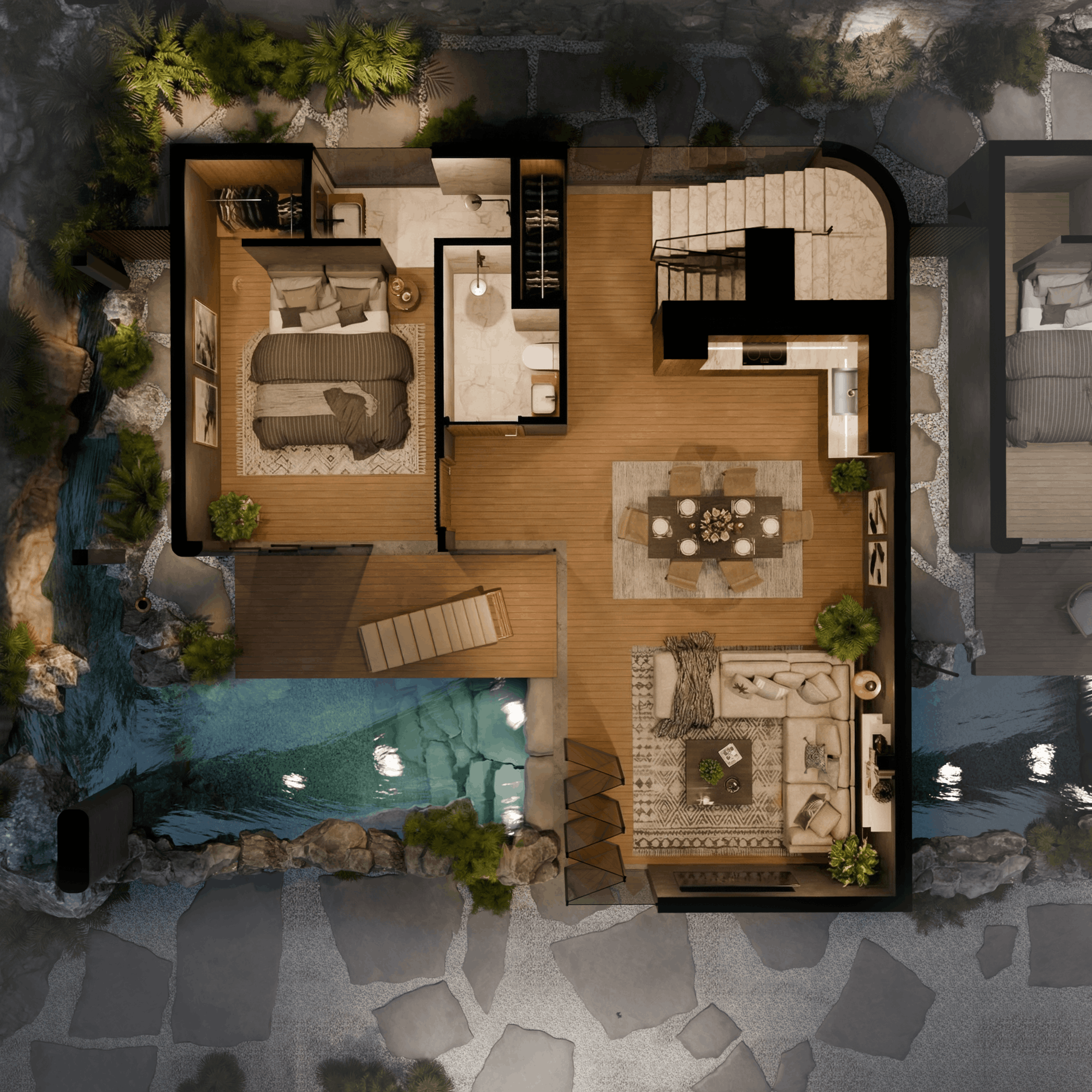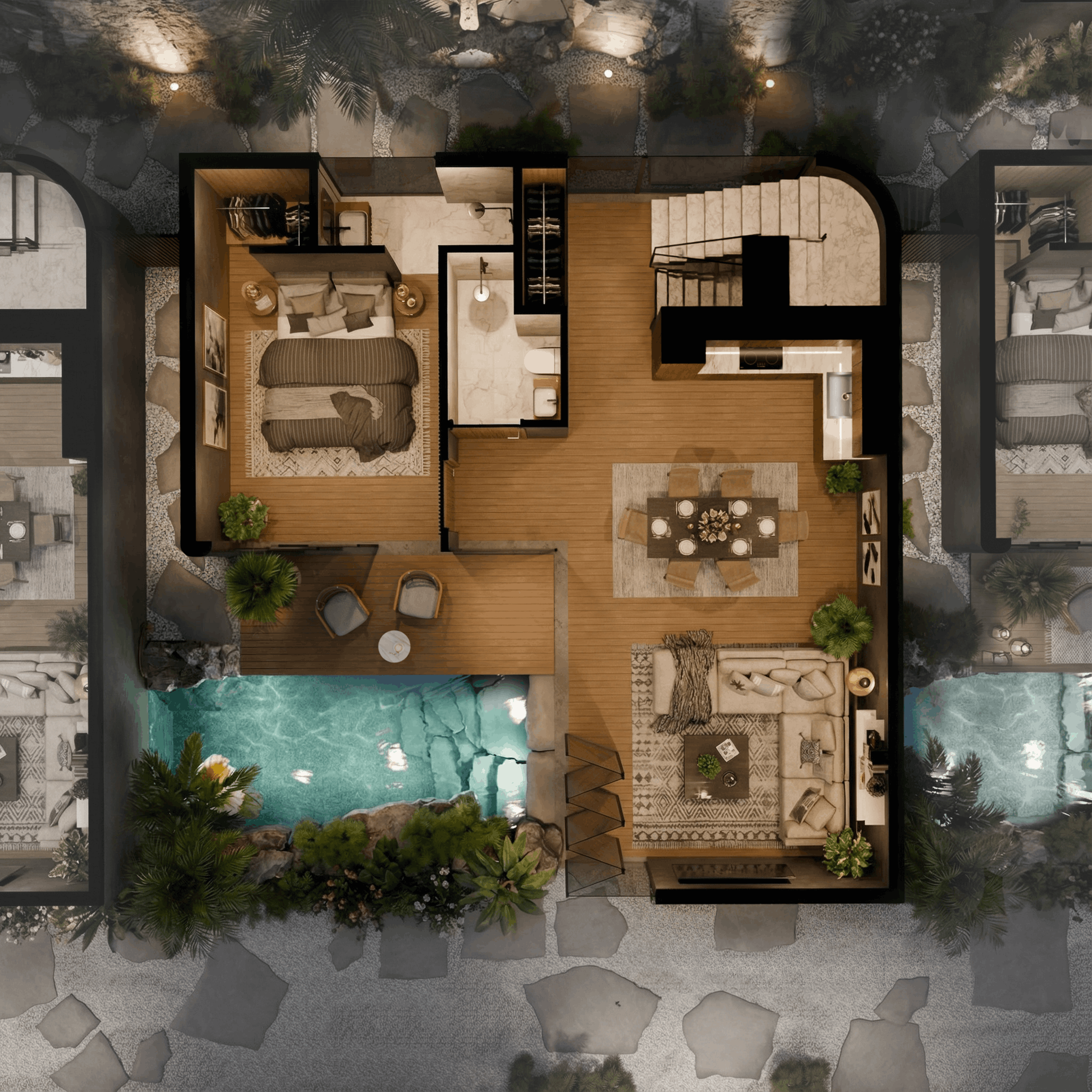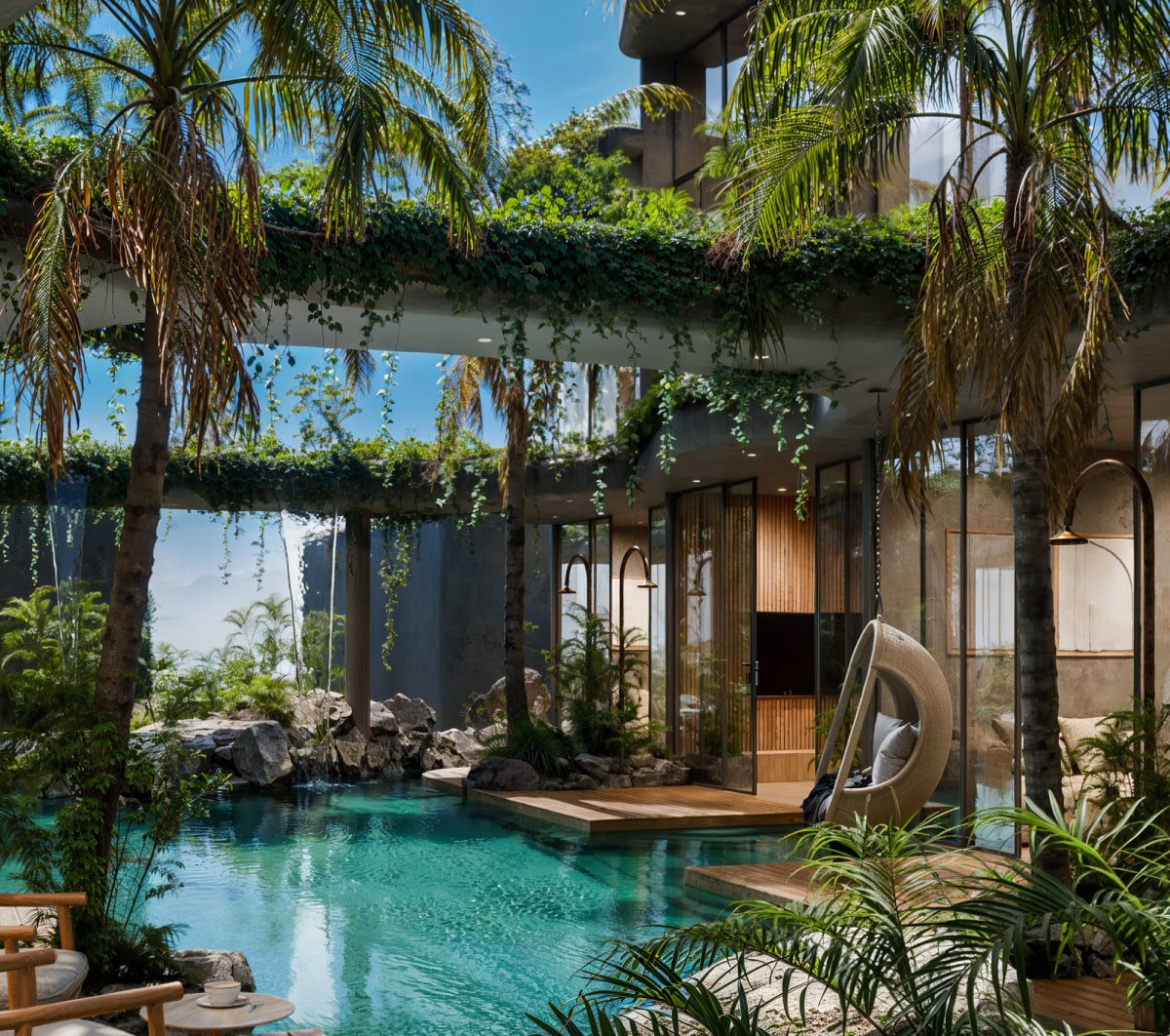 Composed of a living space of 53 sq. meters and a rooftop terrace with deck and green plot of another 40 sq. meters, your Nala Hills appartments are situated over the common pool, feature jungle views, 2 bedrooms and a spacious living room.