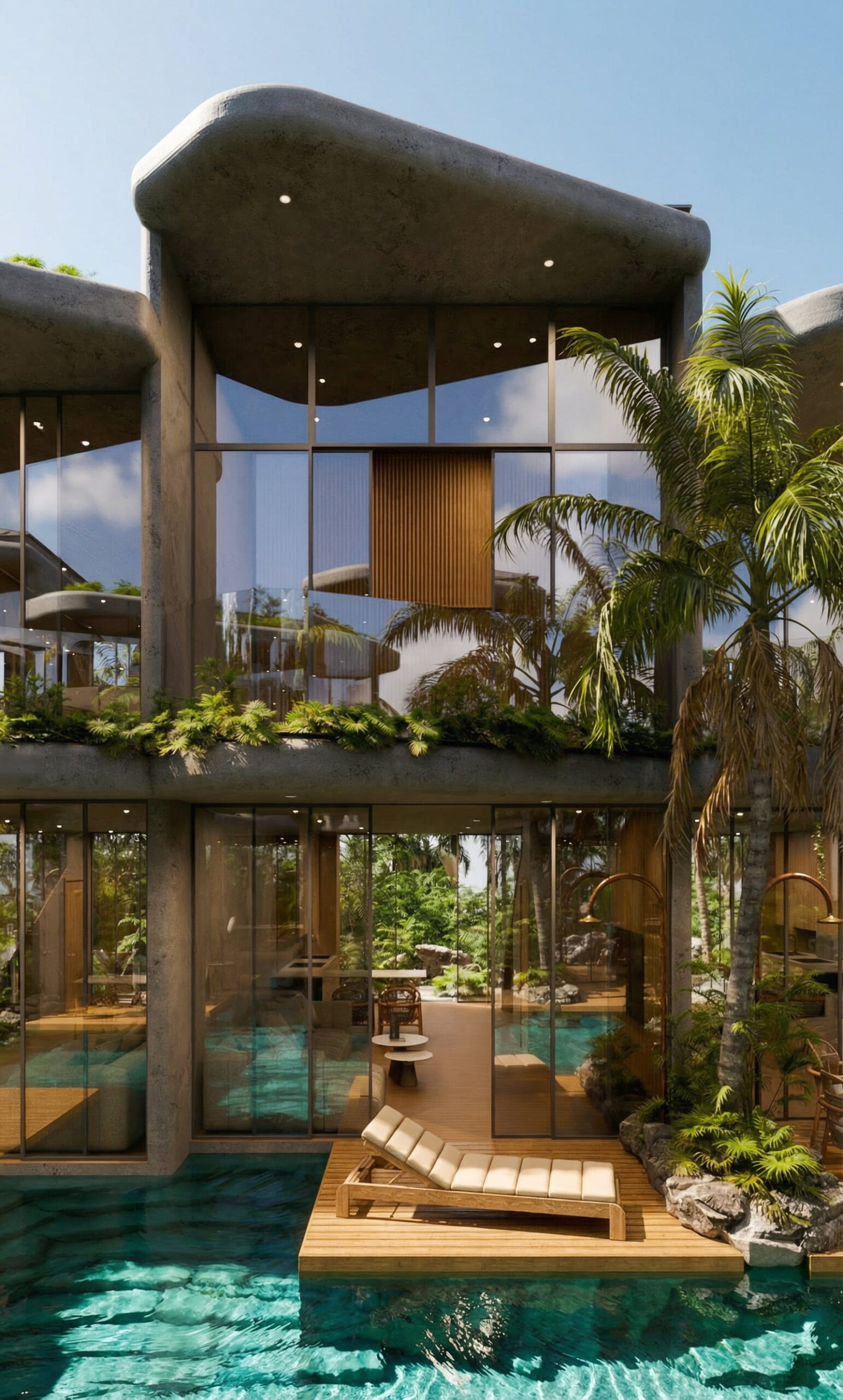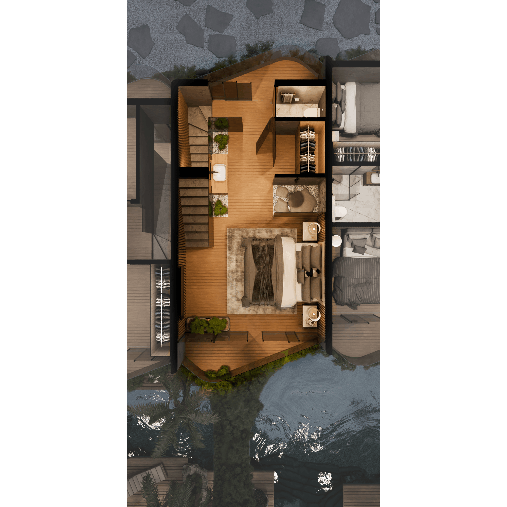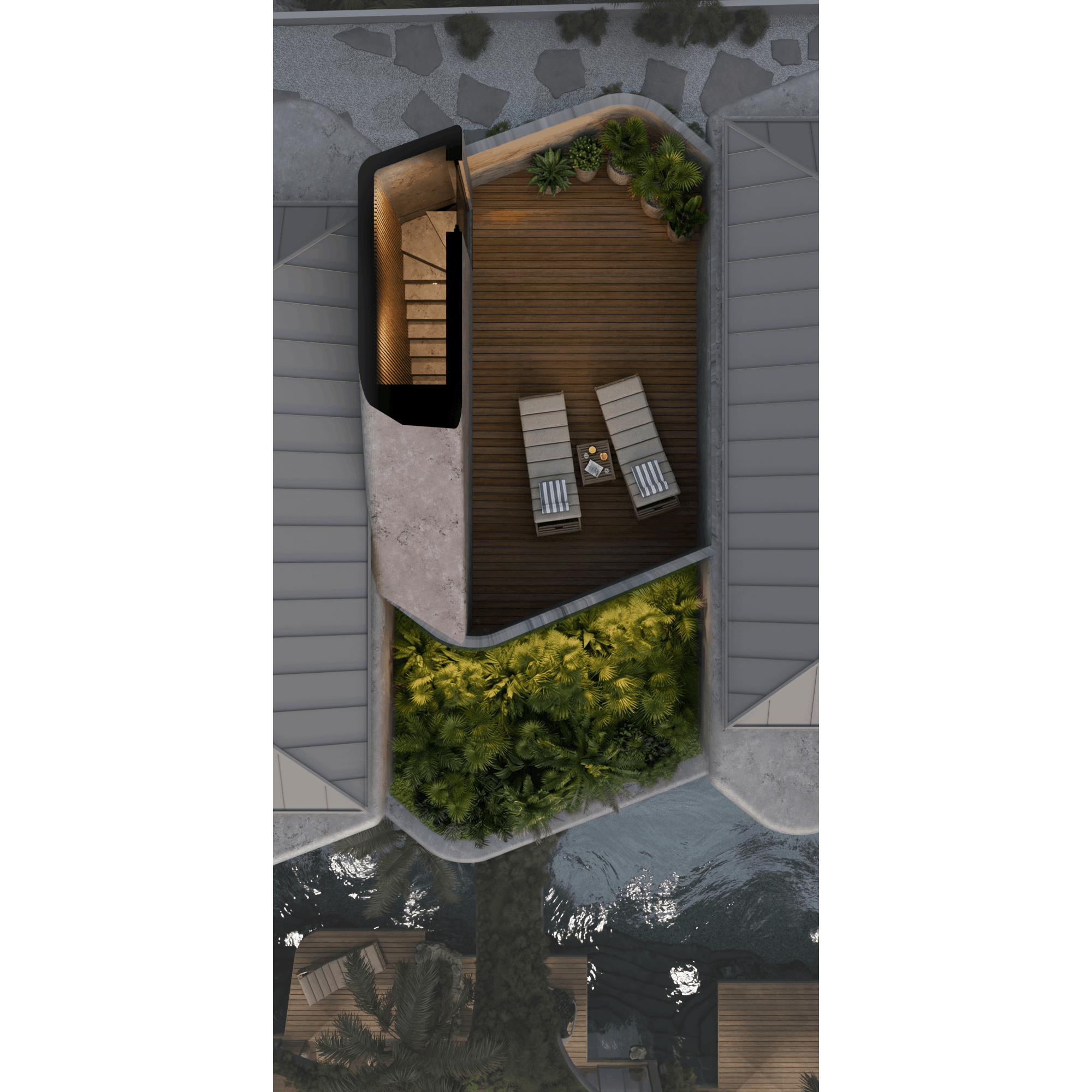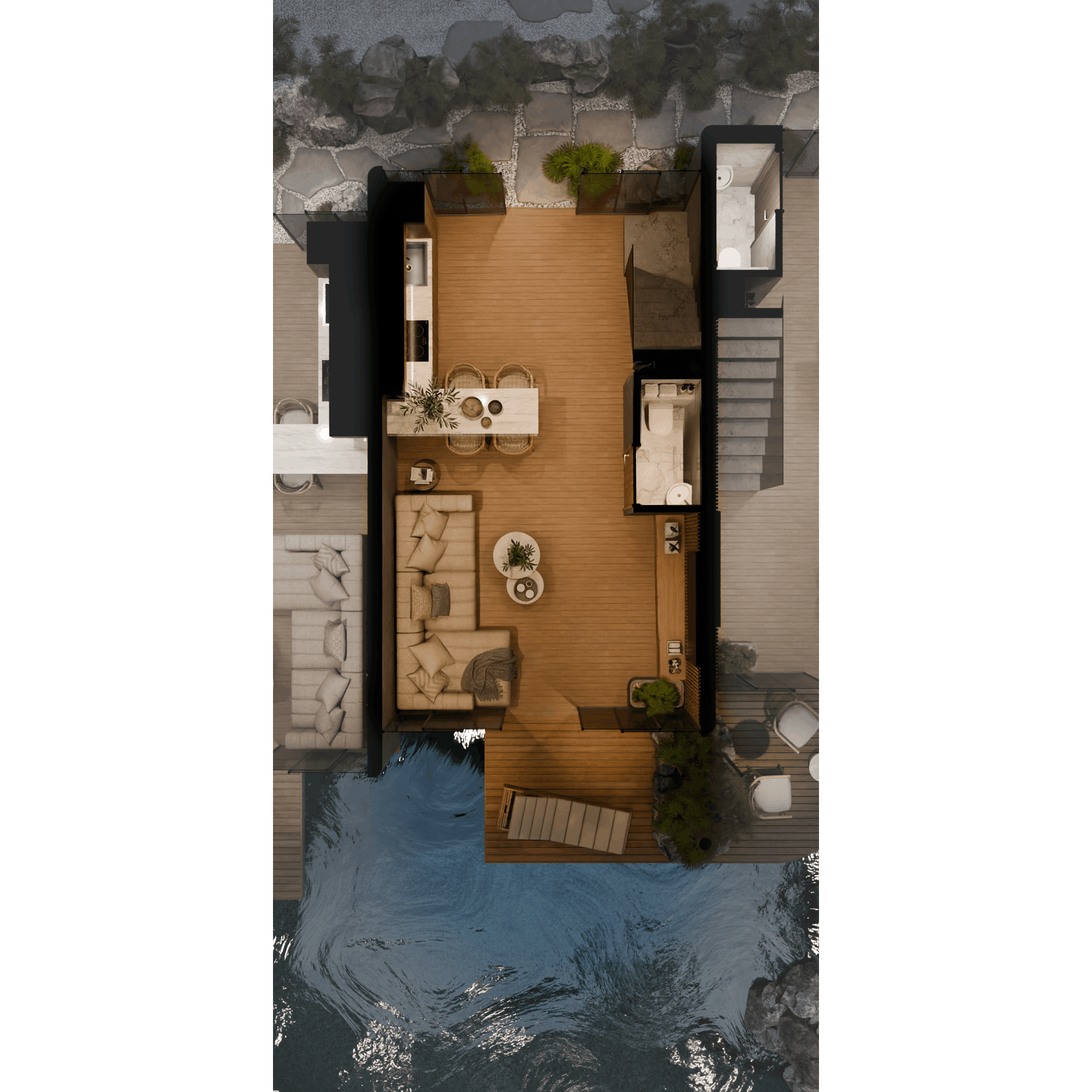 Two types of petite villas are composed of either 2 bedrooms (53 sq.m) or 1 bedroom (54 sq. m) and a terrace (additional 17 sq. m of space and an equal amount of roof greenery). All the villas face the large common swimming pool cleverly separated with plants and rocks for more privacy. Spacious ground floors with immediate access to water are just charming.